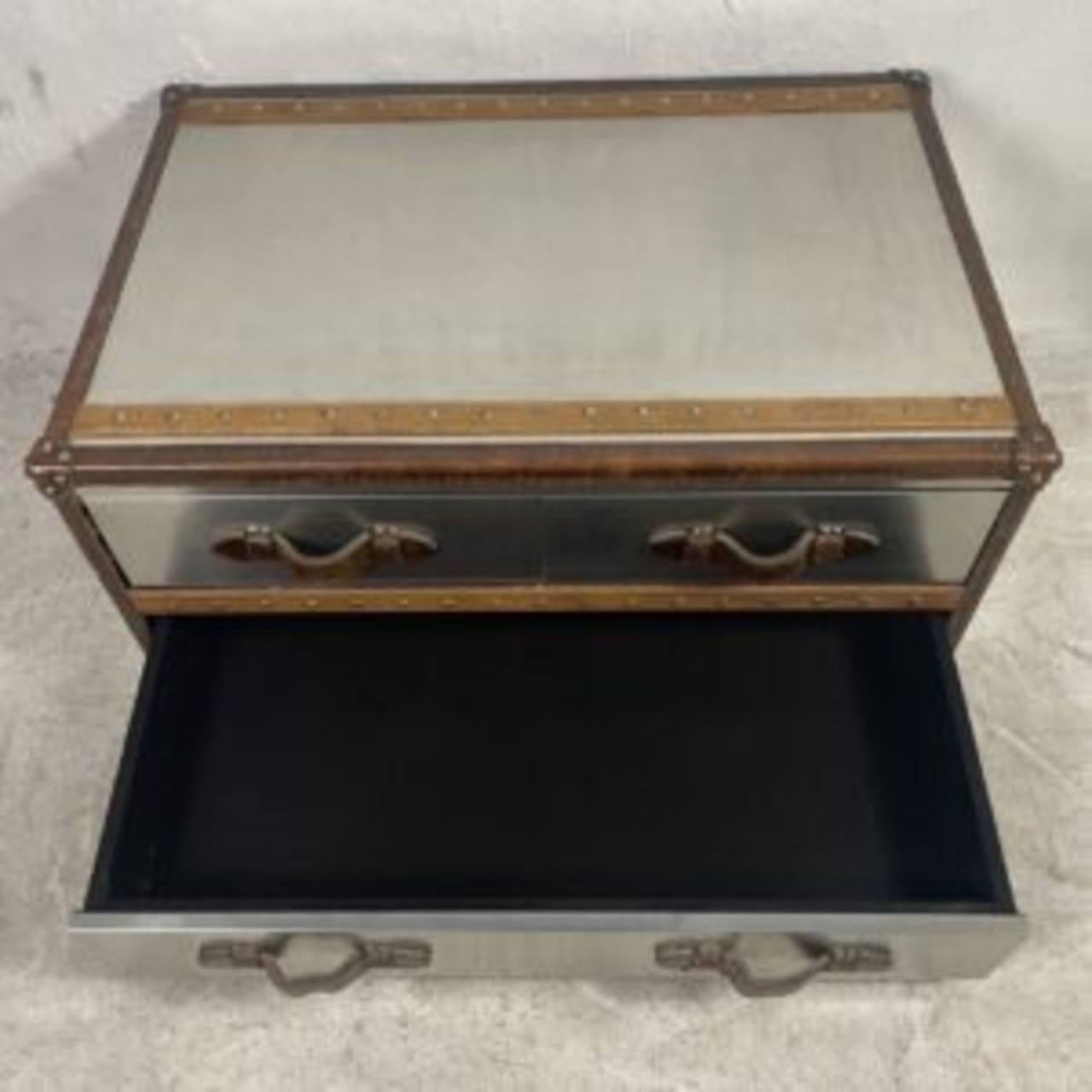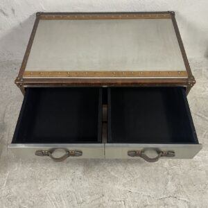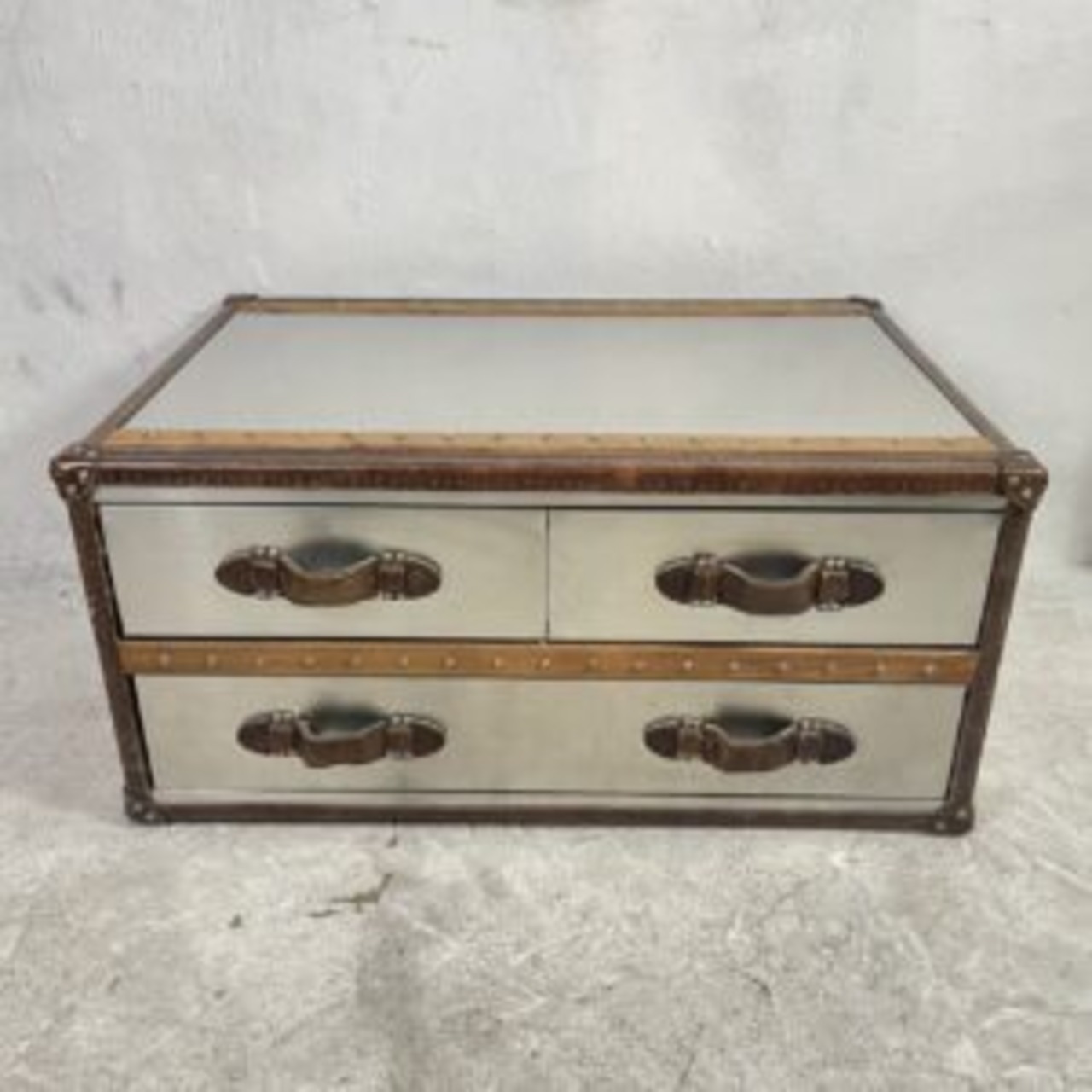 ヴィンテージ感漂うインダストリアルデザインのトランク風ミラーチェスト。