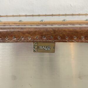 鏡面仕上げのボディにレザー調のトリムとリベットをあしらい、まるでアンティークの旅行トランクを思わせる存在感抜群の一台です。リビングのセンターテーブルやテレビボード、玄関の収納としてもおしゃれに映えるデザイン。