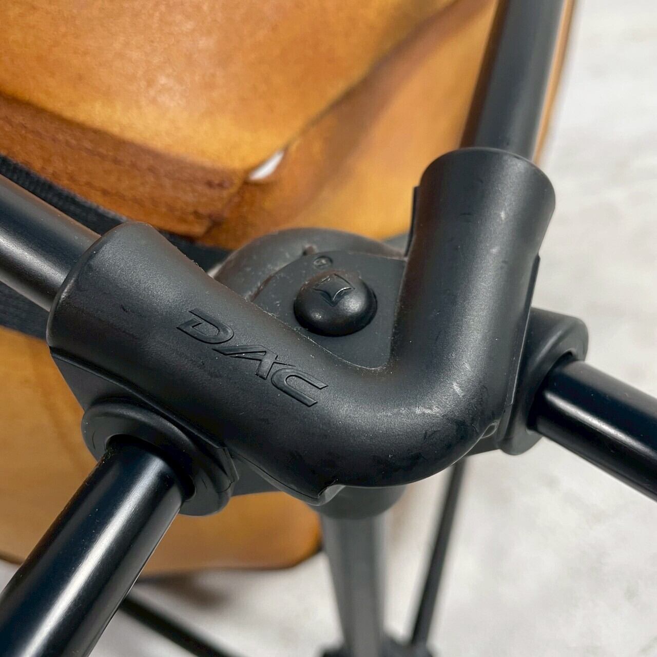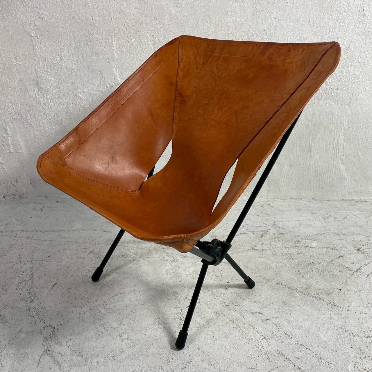 軽量でコンパクトに収納できる設計ながら、レザーシート特有のしっかりとした座り心地とヴィンテージ感のある風合いが魅力。キャンプやアウトドアはもちろん、インテリアとしても映えるデザインチェアです。
