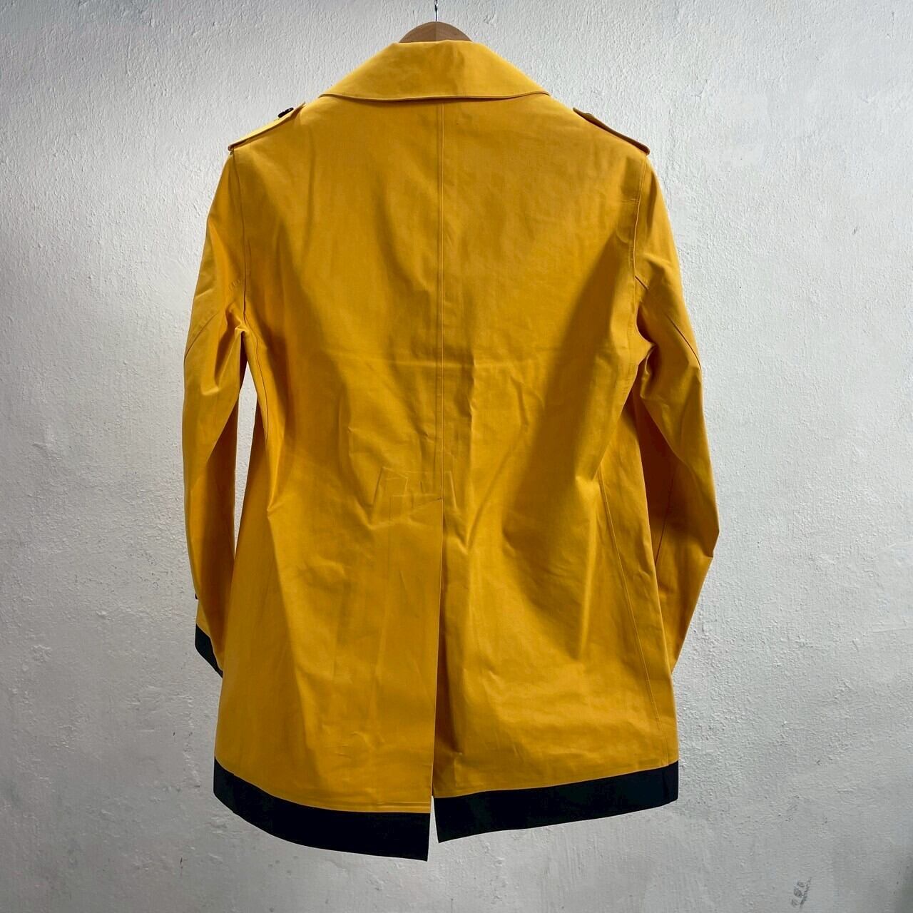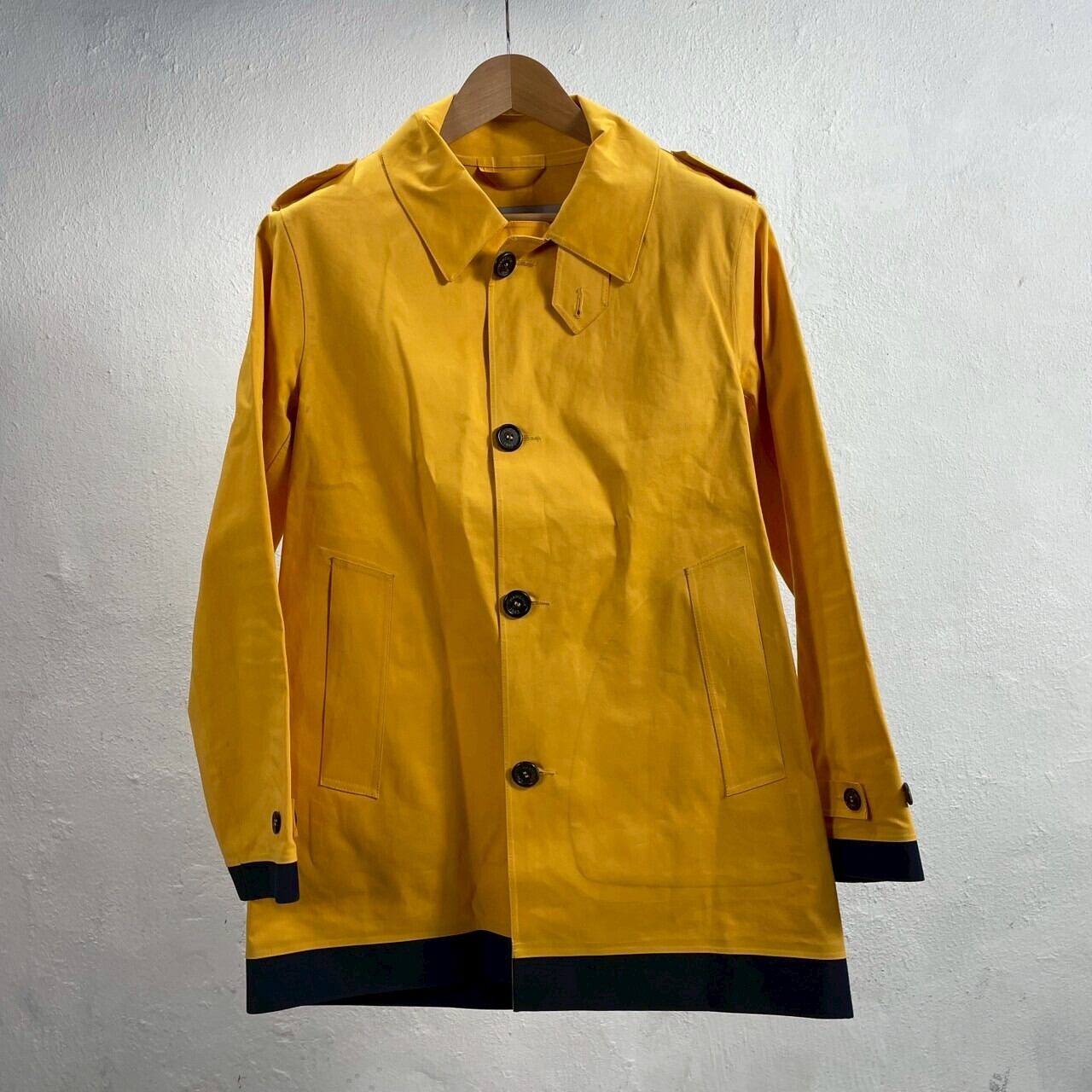 防水性に優れたゴム引き生地を使用しており、雨の日のアウターとしてはもちろん、クラシックな英国スタイルのコーディネートにも最適です。鮮やかなイエローカラーが特徴的で、シンプルなステンカラータイプのデザインはカジュアルからきれいめまで幅広いスタイリングに合わせやすい一着です。