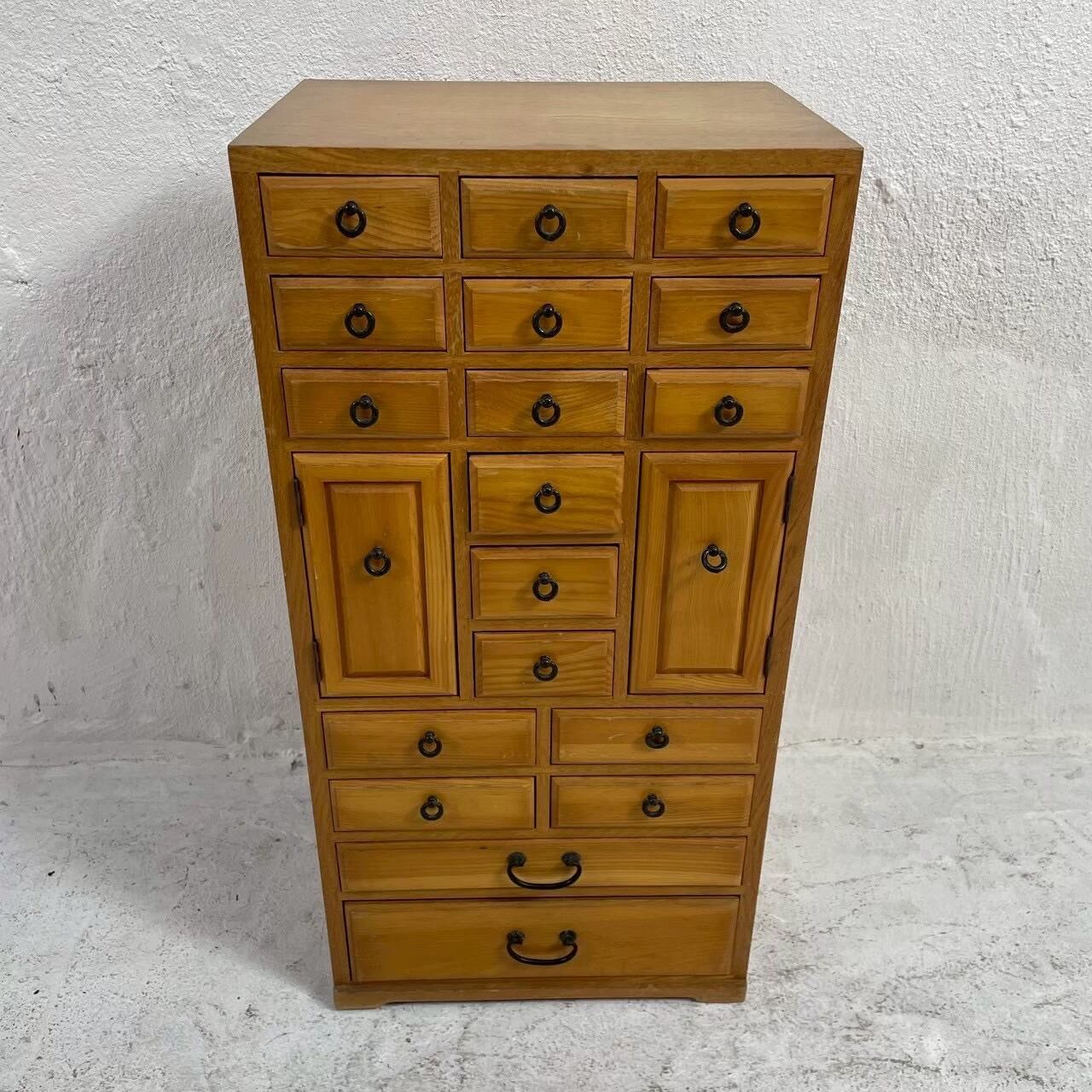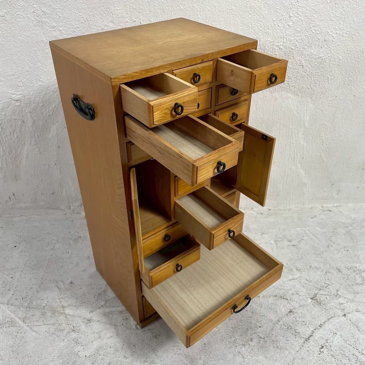 薬箪笥を思わせるデザインで、細かく分かれた引き出しが特徴的な一台。